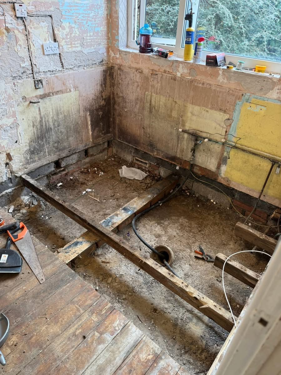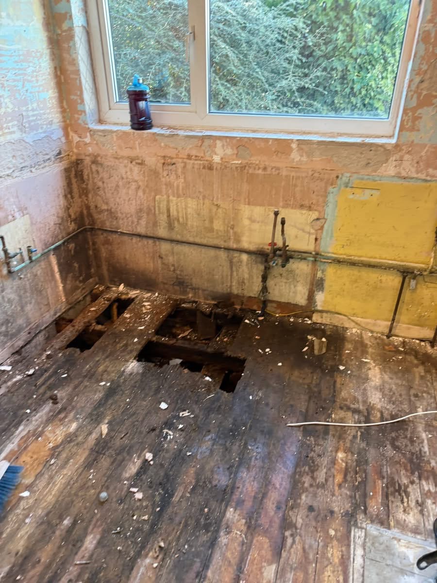 Once the kitchen was stripped back, it became clear that the floor joists and boards were rotting away due to long-term water damage. Not something any homeowner wants to hear — especially in the run-up to Christmas.